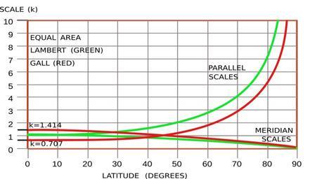 | Keywords: Cyl proj scale Lambert Gall.svg en The Lambert and Gall are equal area projections The green curves commencing at k 1 are for the Lambert the parallel scale k increases from k 1 at the equator to infinity at the pole and the meridian scale decreases from 1 at the equator to zero at the pole The product hk 1 guarantees equal area In the Gall red the parallel scale increases to infinity from k 0 707 at the equator and the meridian scale decreases from k 1 414 at the equator to zero at the pole Both Gall scales are equal h k 1 on the standard parallel defined by k 1 at a latitude of 45 degrees own Peter Mercator Cylindrical projection SVG charts in English Lambert cylindrical equal-area projection Gall-Peters projection |