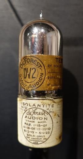 Keywords: Cylindrical Audion, made by Lee deForest's laboratory, c. late 1910s-1920s - National Electronics Museum - DSC00106.JPG Audion triode vacuum tube made by Lee De Forest who invented the Audion in 1906 The Audion was the first vacuum tube which could amplify This is a later model from the mid-1920s as indicated by the silvery getter coating on the inside of the glass envelope As stated on the base the De Forest Co was only allowed to sell tubes to amateurs; De Forest had sold the commercial rights to the tube to Western Electric Exhibit in the National Electronics Museum 1745 West Nursery Road Linthicum Maryland USA All items in this museum are unclassified The museum permitted photography without restriction 2014-07-21 14 29 17 own Daderot cc-zero Vacuum tubes in the National Electronics Museum Uploaded with UploadWizard Audion |