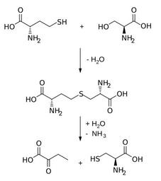 | Keywords: Cysteine biosynthesis unlabeled.svg Diagram showing the biosynthesis of cysteine Homocysteine top left and serine top right are reacted to form cystathionine middle which is next converted to alpha-ketobutyric acid α-ketobutyrate bottom left and cysteine bottom right Own 12 46 25 March 2016 UTC Ed Edgar181 Cysteine Biosyntheses Homocysteine serine Cystathionine |
