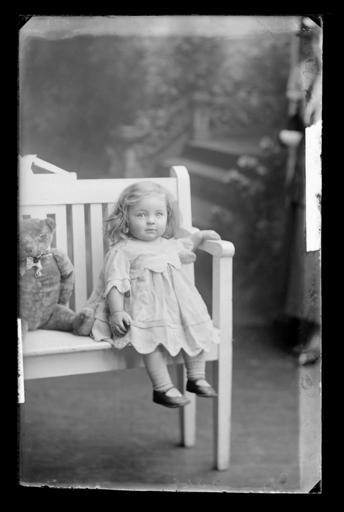 Keywords: proni cooper h.f. cooper hfcooper family family portrait familyportrait genealogy ancestry ulster strabane northern ireland northernireland county tyrone countytyrone lifford county donegal countydonegal child children infant blonde girl eyes seated maryjanes teddybear bear blackandwhite people monochrome photo border surreal black and white Creator: H.F. Cooper Photographer, Strabane Date: c.1910 Original Format: Glass Plate Negative Description: Portrait of a female infant (c.1 year) seated on a bench beside a large teddy-bear PRONI Ref: D1422/B76545/B/16 Copying and copyright: Please see www.proni.gov.uk/index/research_and_records_held/copying_... For Copy Orders, contact: Email: proni@dcalni.gov.uk For fees and charges see: www.proni.gov.uk/index/about_proni/are_there_any_fees_and... Creator: H.F. Cooper Photographer, Strabane Date: c.1910 Original Format: Glass Plate Negative Description: Portrait of a female infant (c.1 year) seated on a bench beside a large teddy-bear PRONI Ref: D1422/B76545/B/16 Copying and copyright: Please see www.proni.gov.uk/index/research_and_records_held/copying_... For Copy Orders, contact: Email: proni@dcalni.gov.uk For fees and charges see: www.proni.gov.uk/index/about_proni/are_there_any_fees_and... |