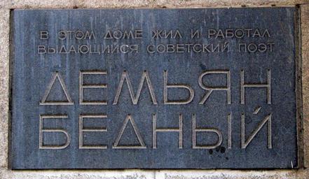 | Keywords: D Bedny House-Moscow, Tverskaya str.8.jpg en The memorial on the wall of the house where lived famous Soviet writer Demyan Bedny Moscow Tverskaya str 8 ru Здесь жил советский поет Бедный Демьян П идво ов Ефим Алексеевич осква Тве ская ул 8 own Vladimir OKC 2010-09-19 Demyan Bedny Tverskaya Street in Moscow 08 Plaques in Moscow Memorial wall signs in Moscow |