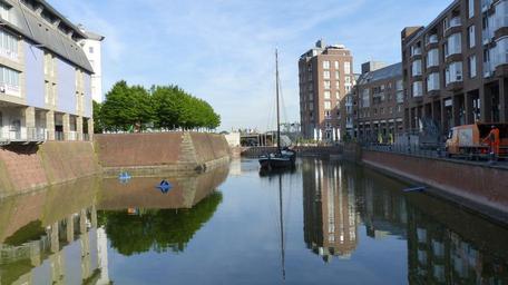 Keywords: düsseldorf old town port boot kahn water houses facades mirroring