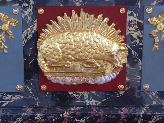 Keywords: Dachstein StMartin 042.JPG Alsace Bas-Rhin Dachstein Eglise Saint-Martin Devant du maître-autel Agnus Dei livre aux sept sceaux own 2012 Ralph Hammann Cc-zero Maître-autel de l'église Saint-Martin de Dachstein Photographs of Dachstein by Ralph Hammann Baroque reliefs in Alsace Reliefs of the Agnus Dei in France Taken with Canon PowerShot SX20 IS Book of Revelation Wooden antependia 18th-century antependia Baroque antependia