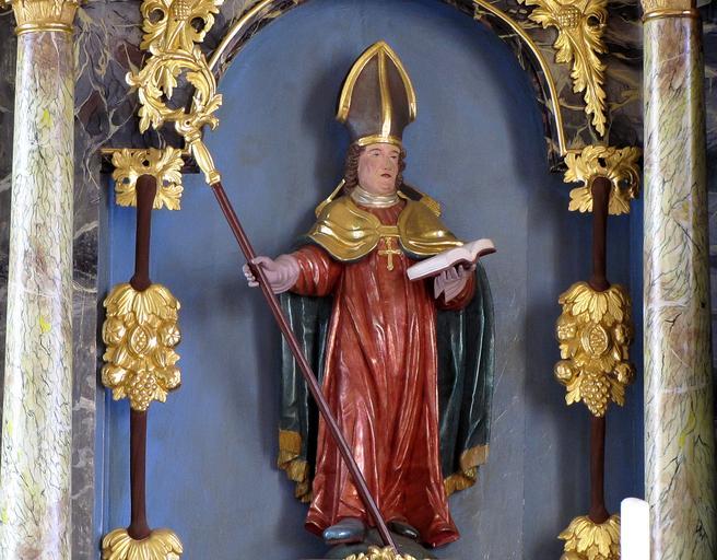 Keywords: Dachstein StMartin 048.JPG Alsace Bas-Rhin Dachstein Eglise Saint-Martin Maître-autel vers 1700 Statue de St-Materne own 2012 Ralph Hammann Taken with Canon PowerShot SX20 IS Photographs of Dachstein by Ralph Hammann Maître-autel de l'église Saint-Martin de Dachstein Baroque statues in Bas-Rhin Wooden statues in Bas-Rhin 18th-century statues in Alsace 1700 statues in France Statues of Christian saints in Alsace Religious statues in Bas-Rhin Statues of Saint Maternus of Cologne Cc-zero