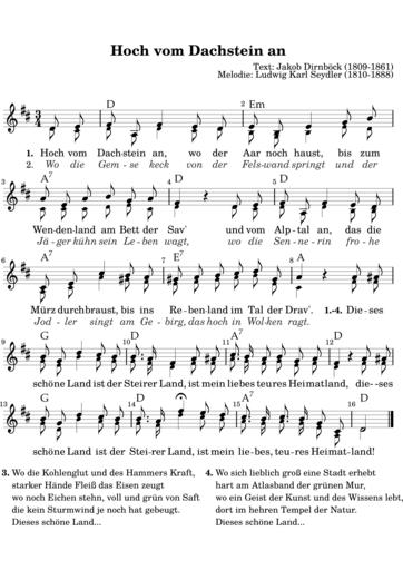 | Keywords: Dachsteinlied SteirischeLandeshymne.gif Das Dachsteinlied Steirsche Landeshymne own Manuela LilyPond source <source lang latex > \version 2 19 37 \language deutsch Absatz 0 5 smallerNoteHead -1 5 myFont Palatino Linotype set-global-staff-size 18 FootLeft string-append FootCenter string-append FootLeft string-append gesetzt mit LILYPOND lilypond-version am strftime d m Y H M S localtime current-time \paper set-paper-size a4 annotate-spacing f top-margin 25\mm ragged-right f ragged-bottom t bottom-margin 5\mm indent 0 line-width 150\mm include-special-characters print-all-headers t oddFooterMarkup \markup \fill-line \abs-fontsize 7 \FootLeft tocItemMarkup \tocItemWithDotsMarkup first-page-number 0 print-first-page-number f Abstand von Liedtext zu nachfolgender à berschrift markup-markup-spacing ' basic-distance 5 padding 5 stretchability 0 Abstand des Textes nach den Noten score-markup-spacing ' basic-distance 3 padding 3 stretchability 0 Abstand der à berschrift vom Notensystem markup-system-spacing ' basic-distance 3 padding 5 stretchability 0 \layout \context \Voice \name FirstVoice \alias Voice autoBeaming f \override NoteCollision merge-differently-dotted t \override NoteCollision merge-differently-headed t \override Stem direction UP \override Slur direction UP \override Tie direction UP \override NoteColumn horizontal-shift 0 \context \Voice \name SecondVoice \alias Voice \remove Slur_engraver \remove Tuplet_engraver autoBeaming f \override NoteCollision merge-differently-dotted t \override NoteCollision merge-differently-headed t \override NoteHead font-size smallerNoteHead \override Stem direction DOWN \override Tie direction DOWN \override NoteColumn horizontal-shift 0 \context \Staff explicitClefVisibility end-of-line-invisible explicitKeySignatureVisibility end-of-line-invisible \override StaffSymbol thickness 0 5 0 3 optimaler wert \override DynamicLineSpanner staff-padding 3 \accepts FirstVoice \accepts SecondVoice \consists Bar_number_engraver \override BarNumber break-visibility end-of-line-invisible \override BarNumber outside-staff-priority ' \override BarNumber padding 1 \override BarNumber self-alignment-X CENTER \context \StaffGroup \remove System_start_delimiter_engraver \accepts AltLyrics \context \Lyrics \name AltLyrics \alias Lyrics \override StanzaNumber font-series 'medium \override LyricText font-shape 'italic \override LyricText color x11-color 'grey20 \context \Score \remove System_start_delimiter_engraver \override RehearsalMark self-alignment-X LEFT \override RehearsalMark outside-staff-priority f \override RehearsalMark extra-offset ' -3 4 \override SpacingSpanner base-shortest-duration ly make-moment 1/16 \remove Bar_number_engraver startRepeatType endRepeatType doubleRepeatType beamExceptions ' \context \ChordNames chordNameLowercaseMinor f majorSevenSymbol \markup maj7 chordChanges f \override ChordName font-name \myFont \override ChordName font-series 'bold \germanChords alignAboveContext leadsheet \context \Voice \override NoteCollision merge-differently-dotted t \override NoteCollision merge-differently-headed t beamExceptions ' autoBeaming f smallerNoteHead -1 5 Lied Hoch vom Dachstein an Anfang myTitel Hoch vom Dachstein an Voice 1 ly parser-include-string string-append \ m myTitel 1\ \relative c' \key d \major \time 3/4 \partial 4 d8 e fis a fis'4 e8 d e h e4 g8 h a e a h g a fis4 r d8 e fis a fis'4 e8 d cis8 e cis'4 h8 a gis a h cis d gis a4 r a8 ais h g d'4 cis8 h h8 a16 fis4 a8 ais cis8 h16 a8 h g a fis4 r a8 ais h g d'4 cis8 h h8 a16 fis'4\fermata e8 d cis8 h16 cis8 h16 g8 cis d2 \bar Voice 2 ly parser-include-string string-append \ m myTitel 2\ \relative c' d8 cis d a d4 cis8 d h g h4 e8 d cis cis cis d e cis d4 s d8 cis d a d4 h8 h a8 cis a'4 gis8 fis e fis gis a h e cis4 s fis8 fis g e h'4 a8 g g8 fis16 d4 fis8 fis a8 g16 fis8 g e fis d4 s fis8 fis g d h'4 a8 g g8 fis16 d'4 cis8 h a8 g16 a8 g16 e8 a d2 Chords ly parser-include-string string-append \ c myTitel \ \chordmode s4 d2 e m a 7 d d a 7 e 7 a g d a 7 d g d a 7 d2 Song Lyrics ly parser-include-string string-append \ l myTitel \ \lyricmode \set stanza 1 Hoch vom Dach -- stein an wo der Aar noch haust bis zum Wen -- den -- land am Bett der Sav' und vom Alp -- tal an das die Mürz durch -- braust bis ins Re -- ben -- land im Tal der Drav' \set stanza 1 -4 Die -- ses schö -- ne Land ist der Stei -- rer Land ist mein lie -- bes teu -- res Hei -- mat -- land die- -ses schö -- ne Land ist der Stei -- rer Land ist mein lie -- bes teu -- res Hei -- mat -- land ly parser-include-string string-append \ l myTitel 2\ \lyricmode \set stanza 2 Wo die Gem -- se keck von der Fels -- wand springt und der Jä -- ger kühn sein Le -- ben wagt wo die Sen -- ne -- rin fro -- he Jod -- ler singt am Ge -- birg das hoch in Wol -- ken ragt \score << \new Staff leadsheet \with << << \context FirstVoice melody ly parser-include-string string-append \\\ m myTitel 1\ \context SecondVoice sndvoice ly parser-include-string string-append \\\ m myTitel 2\ >> \new Lyrics \lyricsto melody ly parser-include-string string-append \\\ l myTitel \ \new AltLyrics \lyricsto melody ly parser-include-string string-append \\\ l myTitel 2\ >> \context ChordNames ly parser-include-string string-append \\\ c myTitel \ >> \header title myTitel poet composer \markup \override ' baseline-skip 1 \right-column Text Jakob Dirnböck 1809-1861 Melodie Ludwig Karl Seydler 1810-1888 piece opus Songtext \markup \fill-line \hspace 0 1 moves the column off the left margin; can be removed if space on the page is tight \column \line \bold 3 \column Wo die Kohlenglut und des Hammers Kraft starker Hände Fleiß das Eisen zeugt wo noch Eichen stehn voll und grün von Saft die kein Sturmwind je noch hat gebeugt Dieses schöne Land \hspace 0 1 adds horizontal spacing between columns; \column \line \bold 4 \column Wo sich lieblich groß eine Stadt erhebt hart am Atlasband der grünen Mur wo ein Geist der Kunst und des Wissens lebt dort im
