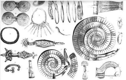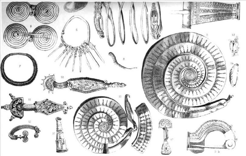 Keywords: Dacian silver and gold objects (pre-Roman Dacia).JPG en Dacian silver and gold objects 1 Fibula Orăştie German Broos Hungarian Szászváros - Hunedoara County 2 fibula Orăştie German Broos Hungarian Szászváros Hunedoara County 3 Gold Tufalau Covasna 4 Silver bracelet Hetur Tarnava Mica Siviu 5a and 5b Golden fibula 6 Silver Somesul Cald 7 Gold torque Sarasau Maramures 8 Gold Bardotiu Transylvania 9 Golden coils Sarasau Maramures 10 Golden coils SarasauMaramures 11 Silver fibula with gold cover Seica Mica Sibiu 12 Silver fibula with gold cover Seica Mica Sibiu 13 Silver chain Somes cald 14 Golden earrings Bardotiu 15 Golden bracelet Åžimleu Silvaniei Hungarian Szilágysomlyó German Schomlenmarkt 16 Golden object Orsiova 17 Fibula with spring Seica Mica Sibiu These images had been included by Tocilescu in his thesis Dacia inainte de Romani 'Dacia before Romans published in 1877 in Annals of the Romanian Academic Society Dacia inainte de Romani 'Dacia before Romans published in 1877 in Annals of the Romanian Academic Society Bucharest Romania to Tocilescu Grigore George 26 October 1850 “ 18 September 1909 1877 PD-old Tocilescu Grigore George 26 October 1850 “ 18 September 1909 was a Romanian historian archaeologist epigrapher and folkorist member of Romanian Academy His thesis Dacia inainte de Romani 'Dacia before Romans published in 1877 in Annals of the Romanian Academic Society Ragguagli de' lavori accademici per l'anno 1826 -1830 Societa reale borbonica Annalele Societatii Academice Romane at Bucuresci Bucharest Romania PD-old-100 ImageNote 1 526 213 17 186 972 615 2 Dacian civilization is quite well represented by spiral details at almost every level of craftsmanship Though discovered evidence is scarce most are golden artifacts who conceptualize the spiral as a reference ImageNoteEnd 1 Dacian bracelets Dacia Dacians Prehistoric Romania Orăștie Grigore Tocilescu |