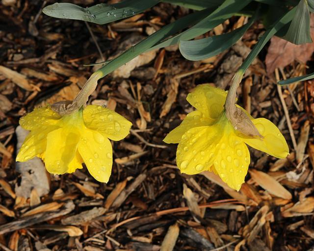 Keywords: daffodils narcissus jonquil yellow flowers petal underside hanging down raindrops water beads