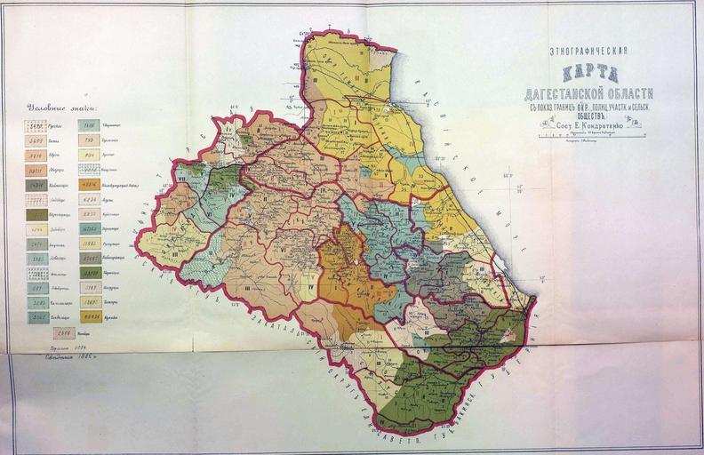 Keywords: Daghestan ethnographic and administrative map 1886.jpg ru Этног афическая ка та Дагестанской области с показом г аниц ок угов полицейских участков и сельских обществ Составил Е Конд атенко асштаб 20 ве ст в дюйме Сведения 1886 года en Daghestan ethnographic map with the boroughs police districts rural communities limits shown Compiled by E Kondratenko Scale 20 versta per inch Data from 1886 1886 http //pushkin19 rusfolder net/foto/view_full_size/w-innki0nc9_ E Kondratenko PD-100 Uploaded with UploadWizard Maps of Dagestan Ethnographic maps in Russian