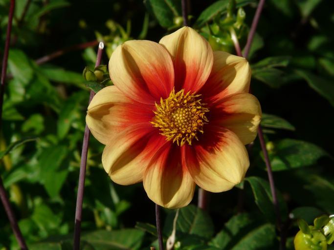 Keywords: dahlia garden yellow orange red flower blossom bloom back light buds dahlia hortensis composites asteraceae simple dahlia easy flowering