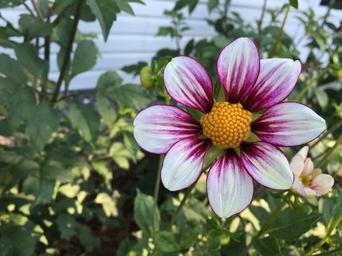 Keywords: dahlia mii tai purple and white petals yellow center flora blossom nature garden