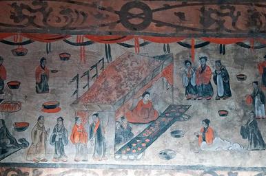 | Keywords: Dahuting tomb banquet scene, mural detail, Eastern Han Dynasty.jpg en The Dahuting Tomb Chinese 打虎亭汉墓 Pinyin Dahuting Han mu; Wade-Giles Tahut'ing Han mu of the late Eastern Han Dynasty 25-220 AD located in Zhengzhou Henan province China was excavated in 1960-1961 and contains vault-arched burial chambers decorated with murals showing scenes of daily life <br>For further information see the Baidu article in Chinese http //baike baidu com/view/230941 htm 打虎亭汉墓 <br>http //blog sina com cn/s/blog_53928e100102voyg html Click here for more pictures and a step-by-step walkthrough of the tomb from the outside down a stairwell and through the vaulted burial chambers Late 2nd early 3rd century AD http //news sina com cn/c/2004-08-25/08044129741 shtml News sina com cn<br> http //www zzldcn cn/Panoramic/Pages/91_1621 html Zzldcn cn National Cultural Information Resources Sharing Project Zhengzhou Branch<br> http //bbs photofans cn/blog php mod view_mob id 56507 Bbs photofans cn<br> https //www synotrip com/henan-province/sky-han/dahuting-han-dynasty-tombs Synotrip com Henan Province<br> https //www tripadvisor com/LocationPhotoDirectLink-g1152494-d1834409-i158766092-Dahuting_Tomb_of_Han_Dynasty-Xinmi_Henan html Tripadvisor com<br> Ancient Chinese artists of the late Eastern Han period other versions Custom license marker 2016 10 11 PD-Art-100 Dahuting Tomb murals Banquets in art |