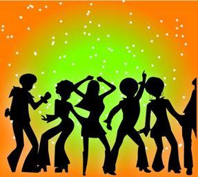 Keywords: dancers disco party black silhouette figures orange green music afros seventies flares nightclub discotheque miniskirt dancefloor retro cool funky club dance people dancing