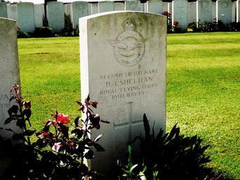 Keywords: Daniel J. Sheehan headstone, Souchez, France.jpg Daniel Joseph Sheehan 66th Squadron of the Royal Flying Corps killed May 1917 <br> in the Cabaret Rouge Cemetery Souchez France <br> Daniel Sheehan's plot no N16 left/rear and the cemetery are cared for by the Commenweath War Graves Commission <br> The cemetery lies at the south end of Souchez on the D937 national road from Béthune in the direction of Arras own Osioni 2007-07 Daniel Martin Michael Sheehan Commonwealth War Graves Commission gravestones to airmen in France Cabaret-Rouge British Cemetery Souchez |