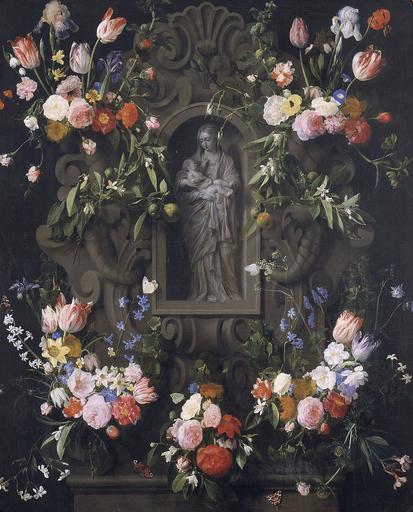 | Keywords: Daniel Seghers Garland with Virgin 1645 paid with gold maulstick 1646.JPG Artwork Q17275908 Creator Daniël Seghers and Creator Thomas Willeboirts Bosschaert title Garland of flowers with a sculpture of the Virgin Mary Bloemencartouche met Mariabeeld 1645 oil canvas cm 151 122 7 Institution Mauritshuis The Hague accession number 256 object history credit line bottom right D Seghers Soctis Jesu 1645 LangSwitch Garlands by Daniël Seghers Virgin by Thomas Willeboirts Bosschaert Cartouche door Daniël Seghers Madonna door Thomas Willeboirts Bosschaert object history Presented to Frederick Henry Prince of Orange in 1645 In return in 1646 Frederick Henry presented a golden maulstick made by goldsmith Hans Coenraad van Brechtel to the Jesuits of which Daniël Seghers was a member Constantijn Huygens secretary to Frederick Henry also wrote a poem in thanks and oversaw exchange The maulstick is now lost but a copy was made ca 1724-1750 see image Own PD-old-100 LangSwitch Notes Noten <references /> Thomas Willeboirts Bosschaert Garland paintings by Daniël Seghers 1645 Flemish paintings in the Mauritshuis Constantijn Huygens Baroque still life paintings of flowers Garland paintings by Daniël Seghers Paintings by two artists |