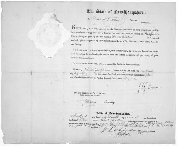 | Keywords: Daniel Waldron Justice of the Peace.jpg en Order of John Taylor Gilman Governor of New Hampshire naming Daniel Waldron a Justice of the Peace for Strafford County New Hampshire 1815 The Library of Congress Washington D C http //memory loc gov/cgi-bin/query/r ammem/rbpe field DOCID+ lit rbpe0910140a http //memory loc gov/rbc/rbpe/rbpe09/rbpe091/0910140a/001dr jpg State of New Hampshire John Taylor Gilman Governor 1815 History of New Hampshire John Taylor Gilman PD-old | ||||