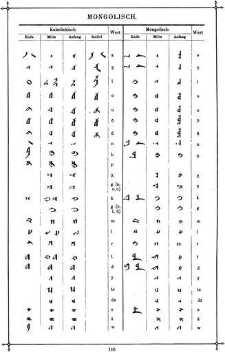 Keywords: Das Buch der Schrift (Faulmann) 131.jpg 130 132 Seite 131 illustriert die traditionelle de Mongolische Schrift and die davon abgeleitete kalmykische de Klare Schrift Todo bichig Todo bichig Mongolian script Alphabet charts