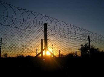 Keywords: dawn sunrise sun orb shiny bright orange yellow fence post barbed wire cloudless sky blue