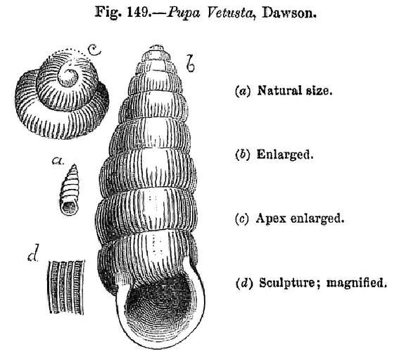 | Keywords: Dawson Acadian Geology Dendropupa from Joggins.png en Historical drawing of shell of the extinct land snail Dendropupa vetusta D<small>AWSON</small> therein referred to as Pupa vetusta preserved in sedimentary infill of lycopsid tree stumps of the Joggins coal measures Joggins Formation Early Pennsylvanian Nova Scotia original figure slightly modified de Historische Zeichnung des Gehäuses der ausgestorbenen Landschnecke Dendropupa vetusta D<small>AWSON</small> hier bezeichnet mit Pupa vetusta die in der Sedimentfüllung von Bärlappbaumstümpfen in den kohleführenden Schichten von Joggins Joggins-Formation frühes Oberkarbon in Nova Scotia überliefert wurde Originalabbildung leicht verändert Acadian geology The geological structure organic remains and mineral resources of Nova Scotia New Brunswick and Prince Edward Island Second edition revised and enlarged Macmillan and Co London 1868 p 384 fig 149 http //hdl handle net/2027/mdp 39015007462503 urlappend 3Bseq 432 Hathitrust John William Dawson 1820-1899 1868 Joggins Fossil Cliffs Illustrations of Gastropoda fossils PD-old PD-US |
