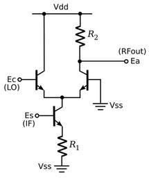 Keywords: DBM SingleEnd IC.svg en Double Balanced Mixer Single End implemented in Integrated Circuit Drawn by myself KStar 2009-11-11 PD Single balanced mixer circuits