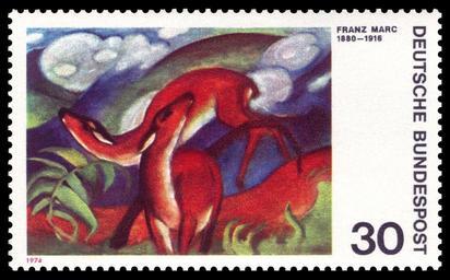 | Keywords: DBP 1974 798 Franz Marc, Die roten Rehe.jpg / Briefmarkenbeschreibung Deutscher Expressionismus German expressionism Ausgabepreis 30 Pfennig First Day of Issue / Erstausgabetag 15 Februar 1974 Michel-Katalog-Nr 798 scanned by NobbiP 2009-05 Creator Franz Marc Copyright information PD-old-auto 1916 PD-ineligible <gallery> File DBP 1974 799 Alexej von Jawlensky Kopf in Blau jpg Alexej von Jawlensky<br />Kopf in Blau File DBP 1974 816 August Macke Mädchen unter Bäumen jpg August Macke<br />Mädchen unter Bäumen File DBP 1974 823 Ernst Ludwig Kirchner Alter Bauer jpg Ernst Ludwig Kirchner<br />Alter Bauer </gallery> Philately Die roten Rehe von Franz Marc Nennwert 30 Pfennig 1974-02-15 Bundesdruckerei 30 100 000 Rastertiefdruck 798 See also <gallery> File Franz Marc 022 jpg </gallery> 1974 Deutsche Bundespost stamps 798 Franz Marc Roe deer on stamps Paintings of roe deer Paintings on stamps of Germany German stamps review keep Animals on stamps of Germany |