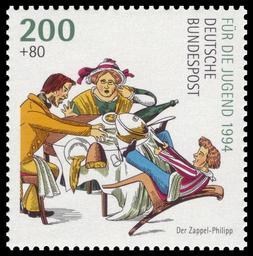 Keywords: DBP 1994 1730 Zappel-Philipp.jpg For the youth 100th day of death of Heinrich Hoffmann Writer Für die Jugend 100 Todestag von Heinrich Hoffmann Autor Graphics by Ehmke Ausgabepreis 200+80 Pfennig First Day of Issue / Erstausgabetag 14 April 1994 Michel-Katalog-Nr 1730 scanned by NobbiP 2011-01-16 creator Heinrich Hoffmann writer PD-old-100 <gallery> File DBP 1994 1726 Paulinchen jpg Paulinchen File DBP 1994 1727 Hanns Guck-in-die-Luft jpg Hanns Guck-in-die-Luft File DBP 1994 1728 Struwwelpeter jpg Struwwelpeter File DBP 1994 1729 Der böse Friederich jpg Der böse Friederich </gallery> Philately Zappel-Philipp Nennwert 200+80 Pfennig 1994-04-14 Ehmke 2 945 000 Offsetdruck 1730 1994 stamps of Germany 1730 Children's literature on stamps Jugendmarken Reception of Struwwelpeter Attention Deficit Hyperactivity Disorder German stamps review keep |