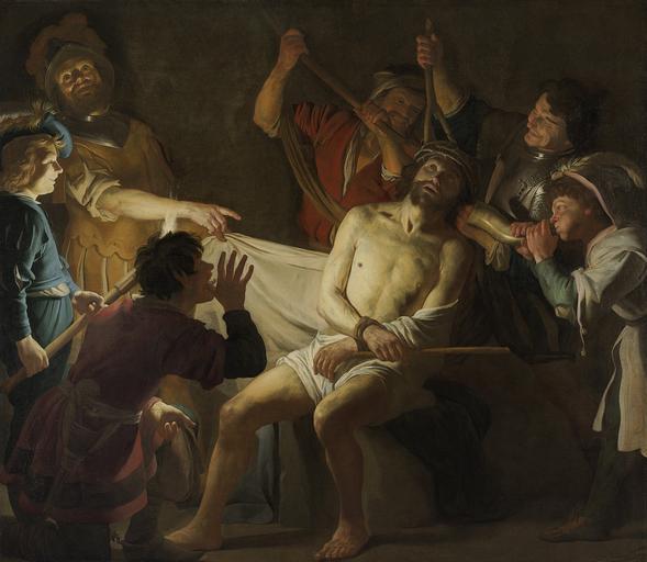 Keywords: De doornenkroning van Jezus Rijksmuseum SK-A-4837.jpeg nl De doornenkroning van Christus In het midden zit Christus het gelaat ten hemel opgeheven de polsen geboeid en de doornenkroon op het hoofd Rechts op de voorgrond blaast een jongen met een hoorn in Christus' oor Achter zijn linkerschouder staat een soldaat in harnas die met een stok de doornenkroon stevig vastdrukt Achter zijn rechterschouder een andere beul die met een stok de doornenkroon verder aandrukt Links op de voorgrond een knielende knecht met de hand bij de mond en uitgestoken tong Linksachter een gehelmde soldaat die aan het kleed van Christus trekt en lachend naar hem wijst uiterst links een jongen met een fakkel ; Gerard van Honthorst 1592 “1656 olieverf op doek ca 1622 drager Height cm 192 4 drager Width cm 221 5 exhibition history 2006-2006 Rembrandt and Caravaggio Meesters van het Licht Amsterdam Institution Rijksmuseum Technique oil canvas object history Acquisition 1986 object type Potential derivatives exist check http //commons wikimedia org/w/index php search Rijksmuseum+SK-A-4837 this search PD-US PD-old-100 Data and photography rights All data and all images made available through the API are either in the public domain or are subject to a CC0 license https //www rijksmuseum nl/en/api/terms-and-conditions-of-use cc-zero place of creation Rijksmuseum Amsterdam Jaarverslag 2006 p 54'Keuze uit de aanwinsten' Bulletin van het Rijksmuseum 35 1987 2 p 110 afb 1Peter Hecht en Ger Luijten 'Nederland verzamelt oude meesters Tien jaar aankopen en achtergronden' Kunstschrift Openbaar Kunstbezit 6 1986 p 200-201 afb 30H Braun Gerard van Honthorst Göttingen 1966 cat nr 35B Nicolson 'Caravaggio and the Netherlands' The Burlington Magazine 94 1952 p 251H Gerson 'Die Ausstellung Caravaggio und die Niederlande' Kunstchronik 5 1952 p 289G A Meijer Gedenkboek der Dominicanen in Nederland 1803-1910 Nijmegen 1912 p 257 http //www rijksmuseum nl/collectie/SK-A-4837 De doornenkroning van Jezus Q17341058 Uploaded with GWToolset De doornenkroning van Jezus Rijksmuseum SK-A-4837 http //www rijksmuseum nl/media/assets/SK-A-4837 Images uploaded by Fæ Images from the Rijksmuseum Paintings by Gerard van Honthorst in the Rijksmuseum Amsterdam New Testament paintings by Gerard van Honthorst