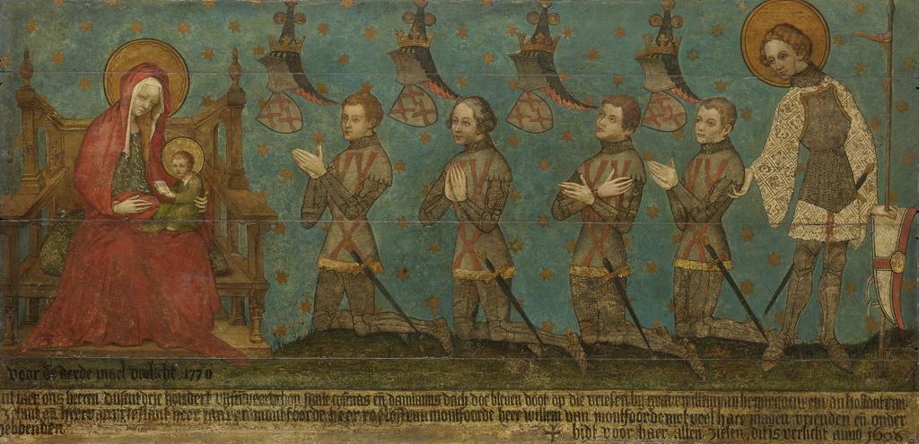 | Keywords: De heren van Montfoort Rijksmuseum SK-A-831.jpeg accession number SK-A-831 nl Gedachtenistafel van de Heren van Montfoort Links zit Maria met het Christuskind op een troon Rechts knielen in aanbidding vier heren van Montfoort gekleed in gelijkvormige wapenrustingen Boven iedere figuur een wapenschild gedekt door een helm met kroon en vlucht Rechts staat de heilige Joris Voorgesteld zijn van links naar rechts Jan I van Montfoort zijn oudoom Roelof de Rover zijn oom Willem de Rover en een man die vermoedelijk Hendrik de Rover Willemsz voorstelt De eerste drie mannen sneuvelden in het gevolg van graaf Willem van Henegouwen tijdens zijn veldtocht tegen de Friezen in 1345 Geschilderd voor het altaar van de heilige Maagd in de Sint Janskerk te Linschoten ; Noordelijke Nederlanden ca 1400 olieverf op paneel drager Height cm 69 5 drager Width cm 142 9 lijst Height cm 86 lijst Width cm 157 5 lijst Dikte cm 6 exhibition history 2011-2012 Langdurig Bruikleen Centraal Museum-II Utrecht 2004-2009 Bruikleen tijdens renovatie RM Centraal Museum Utrecht Utrecht 1958-1958 Middeleeuwse Kunst der Noordelijke Nederlanden Amsterdam Institution Rijksmuseum Technique oil panel object history Acquisition 1884-08-09 object type Potential derivatives exist check http //commons wikimedia org/w/index php search Rijksmuseum+SK-A-831 this search PD-US PD-old-100 Data and photography rights All data and all images made available through the API are either in the public domain or are subject to a CC0 license https //www rijksmuseum nl/en/api/terms-and-conditions-of-use cc-zero place of creation Noordelijke Nederlanden Bart Ibelings 'De opdrachtgever en oudst bekende restauratie van de memorietafel van de heren van Montfoort' Heemtijdinghen 48 2012 nr 2 p 65-74 Liesbeth M Helmus Schilderen in opdracht Noord-Nederlandse contracten voor altaarstukken 1485-1570 Utrecht 2009 p 44M J Bok 'Laying claims to nobility' Simiolus 2/3 1996 p 222-223 + afb Bart Ibelings De opdrachtgevers en oudst bekende restauratie van de memorietafel van de heren van Montfoort Heemtijdinghen 48/2 2012 Jaarboek Amstelodamum 88 1996 p 31 + afb W van Anrooij 'De Memorietafel van de heren van Montfoort en het Hollandse gravenhof omstreeks 1400' in Madoc tijdschrift over de Middeleeuwen 3 1989 nr 2 p 22-28H W van Os 'De gebreken van de beeldtaal' O K 23 1979 nr 5 p 134 afb 6R Terner 'Bemerkungen zur Madonna des Kanonikus van der Paele' Zeitschrift für Kunstgeschichte 42 1979 p 85 afb 4 N Plomp Een Linschotens schilderstuk uit de veertiende eeuw Heemtijdinghen 13 1977 p 44-49 K Bauch 'Bildnisse des Jan van Eyck' Studien zur Kunstgeschichte 1967 p 105 Marius Pieter van der Linden De burggraven van Montfoort in de geschiedenis van het Sticht Utrecht en het graafschap Holland ± 1260-1490 Assen 1957 K G Boon Maandblad voor Beeldende Kunst 1950 p 263 A Hulshof Utrechtse panelen Utrecht 1944 afb 29 vgl miniatuur van Willem van Montfoort en getijdenboekJ Blok 'Gegevens van de geschiedenis der kleederdrachten kleeding in de 14de eeuw uit de rekeningen der grafelijkheid' Bulletin van den Nederlandsch Oudheidkundige Bond 1914 p 185 189 over de harnassenNavorscher XXII p 269 Gerson Geertgen p 8 afb 4 Documentatiemap Schilderijen aantekeningen R van Luttervelt voor 1963 Correspondentie Gemeentearchief Amsterdam C Noordam over Hendrik Rover van Heulestein 9 april 1996; correspondentie H M Zijlstra-Zweens over de afgebeelde helmen 14 juli 1986; overdruk tentoonstellingscatalogus 'Die Parler' 1978 Documentatiemap Schilderijen papiertje met naam van schenker 1884; correspondentie over identificatie Heren van Montfoort 1996 http //www rijksmuseum nl/collectie/SK-A-831 De heren van Montfoort Uploaded with GWToolset De heren van Montfoort Rijksmuseum SK-A-831 http //www rijksmuseum nl/media/assets/SK-A-831 Images uploaded by Fæ Images from the Rijksmuseum Early Netherlandish paintings in the Rijksmuseum Amsterdam |