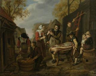 | Keywords: De varkensslachter Rijksmuseum SK-C-259.jpeg nl De varkensslachter Tussen schuren achter een huis krijgt een man die bezig is een varken te slachten een glas bier aangereikt van een vrouw Rechts spelen enkele kinderen een jongen blaast een varkensblaas op links een knecht en een meid Height cm 79 5 Width cm 99 5 exhibition history 2004-2005 Van der Hoop - C Amsterdam Institution Rijksmuseum Technique oil canvas object history Acquisition 1885-06-30 object type Potential derivatives exist check http //commons wikimedia org/w/index php search Rijksmuseum+SK-C-259 this search PD-US PD-old-100 Data and photography rights All data and all images made available through the API are either in the public domain or are subject to a CC0 license https //www rijksmuseum nl/en/api/terms-and-conditions-of-use cc-zero place of creation http //www rijksmuseum nl/collectie/SK-C-259 De varkensslachter Q17342345 Uploaded with GWToolset De varkensslachter Rijksmuseum SK-C-259 http //www rijksmuseum nl/media/assets/SK-C-259 Images uploaded by Fæ Images from the Rijksmuseum Paintings by Jan Victors in the Rijksmuseum Amsterdam |