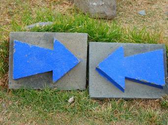 Keywords: dead end blind alley stop arrows blue opposites contrast contradictory counter collision each other to each other attract signposts misleading case