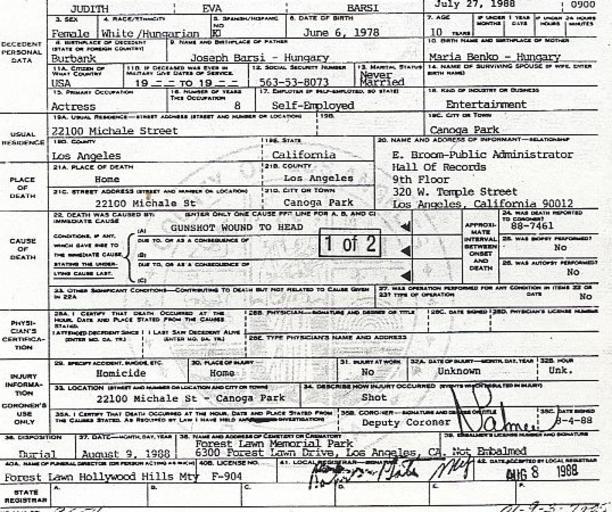 Keywords: Death certificate of Judith Barsi.jpg en The death certificate of Judith Barsi 1978-1988 1988 http //www findadeath com/Deceased/b/Judith 20Barsi 20story/dc jpg US Government PD-USGov Uploaded with UploadWizard Judith Barsi