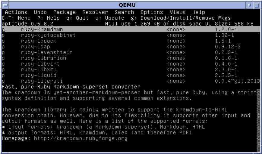 | Keywords: Debian 7 Aptitude Interaction.png en Browsing interactively through Debian GNU/Linux 7 packages using the aptitude program Running in a QEMU VM 2014-01-23 20 52 57 own Huihermit cc-zero Uploaded with UploadWizard Debian screenshots Aptitude software |