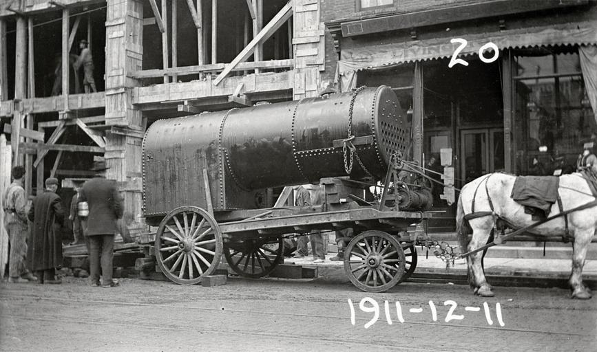 Keywords: kalamazoo hanselman building hanselmanbuilding boiler horse workers construction skyscraper vehicle monochrome blackandwhite outdoor black and white A large boiler, possibly for the building's heating plant, is delivered. A large boiler, possibly for the building's heating plant, is delivered. |