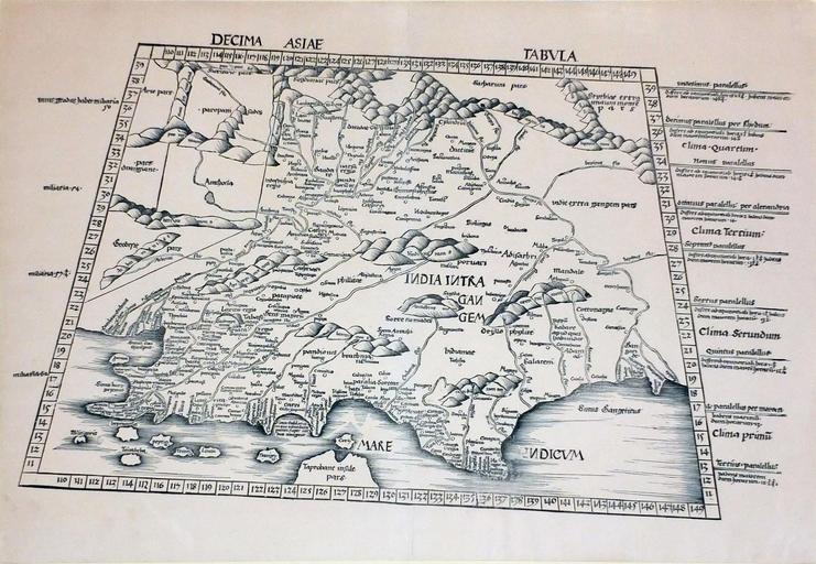 Keywords: Decima Asiae Tabula.jpg en A slanted photograph of a copy of the 10th Asian Map Decima Asiae Tabula depicting India within the Ganges India intra Gangem from the Strasbourg Ptolemy apparently using a map cut by Johann the Blockcutter Johannes Schnitzer de Armssheim as it displays his characteristic reversed N 1513 http //pictures abebooks com/ARADERNYC/19590091986 jpg Abe Books Ptolemy other versions PD-old-70-1923 1513 maps Strasbourg Ptolemy Maps in Latin Johann the Blockcutter Ptolemy's 10th Asian Map 1513 |