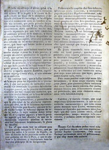 Keywords: Declaración de igualdad a los indígenas del Río de la Plata 02.jpg es Declaración de igualdad a los indígenas por parte de la Junta Grande las Provincias Unidas del Río de la Plata en 1811 El documento está redactado en español y quechua 1811 Archivo General de la Nación Argentina Junta de Gobierno de las Provincias Unidas del Río de la Plata other versions Custom license marker 2015 09 19 PD-old-100 1811 in Argentina 1811 documents Colonial history of Argentina United Provinces of Río de la Plata Quechuan languages Indigenous peoples of Argentina Uploaded with UploadWizard