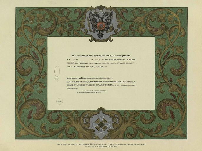 Keywords: Decoration for services in land reform (certificate).jpg ru Рисунок г амоты выдаваемой к естьянам пожалованным Знаком отличия за т уды по землеуст ойству 1912 К аткий оче к за десятилетие 1906-1916 / Ком по землеуст оительным делам Пет ог ад 1916 author Custom license marker 2013 10 06 PD-RusEmpire Uploaded with UploadWizard Orders decorations and medals of the Russian Empire Stolypin land reform |
