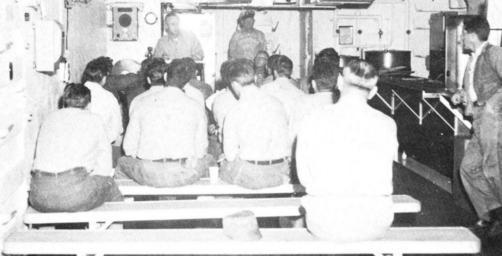 | Keywords: Deepfreeze I 471b.jpg Lt Harry Divens the officer in charge of detachment bravo cargo handling battalion three delivering a lecture on safety precautions to cargo handling personnel during the voyage to the Antarctic Lt Divens detachment was assigned to the task force for the duration of the operation This detachment helped to onload approximately 21 000 measurement tons of cargo at Kainan Bay and McMurdo Sound Report of Operation DEEPFREEZE I 1955-56 U S Navy Task Force 43 Washington D C 843 pp 1956 United States Navy Original work of the US Federal Government - public domain PD-USGov Operation Deep Freeze I |