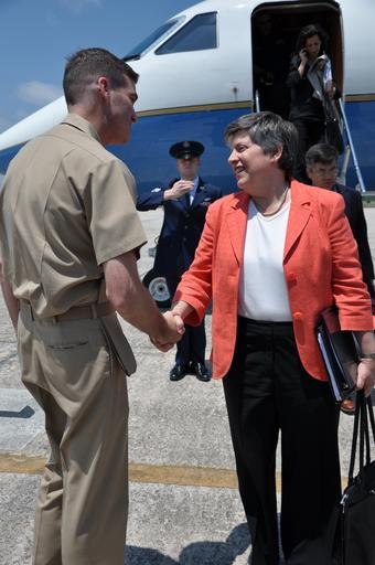 Keywords: Deepwater Horizon DVIDS278251.jpg en Capt Christopher W Plummer commanding officer of Naval Air Station Pensacola greets Department of Homeland Security Secretary Janet Napolitano as she arrives at the air station to meet with state and local officials and provide an update on the Deepwater Horizon oil spill in the Gulf of Mexico 2010-05-06 U S Navy photo by Anne Thrower https //www dvidshub net/image/278251 100506-N-+++++-003 2010-05-11 22 27 PENSACOLA FL US PD-USGov-Military-Navy Naval Air Station Pensacola Images from DoD uploaded by Fæ |
