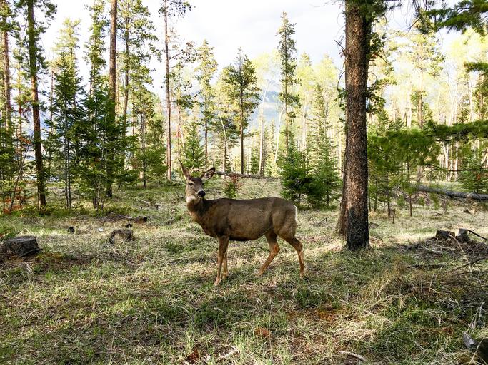 Keywords: deer mule deer nature wildlife animal mammal wild outdoors doe fur habitat environment forest mountains trees woods country