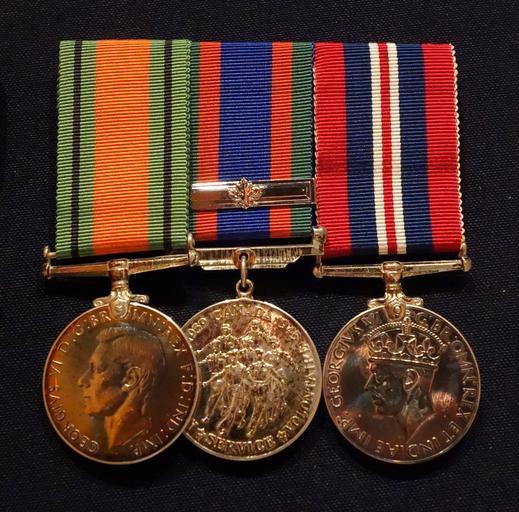 MAKE A MEME View Large Image Defence Medal, Canadian Volunteer Service Medal with Clasp, 1939-1945 War Medal, awarded to Wing Commander Lawrence L. MacKinnon, 405 Squadron RCAF - Glenbow Museum - DSC00625.JPG en Exhibit in the Glenbow Museum 130 9th Ave S E Calgary ...