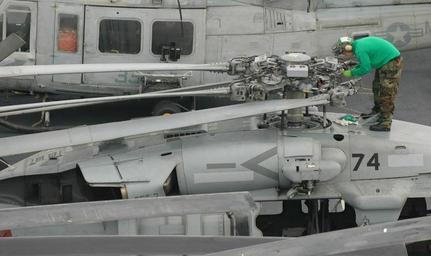 Keywords: Defense.gov News Photo 051201-N-9866B-002.jpg en A Navy airman scrutinizes the rotor head of a SH-60S Seahawk helicopter prior to flight operations on the flight deck of the amphibious assault ship USS Peleliu LHA 5 as the ship operates in the Pacific Ocean on Dec 1 2005 Peleliu is off the coast of Southern California for an expeditionary strike group exercise 051201-N-9866B-002 Navy http //www defense gov/photos/newsphoto aspx newsphotoid 7381 2005-12-01 en Petty Officer 2nd Class Zack Baddorf U S Navy PD-USGov-Military-Navy Defense gov news media for December 2005 Import by User Slick-o-bot/Defense gov News Photos SH-60 Seahawk Taken with Nikon D70 Aboard USS Peleliu LHA-5 |