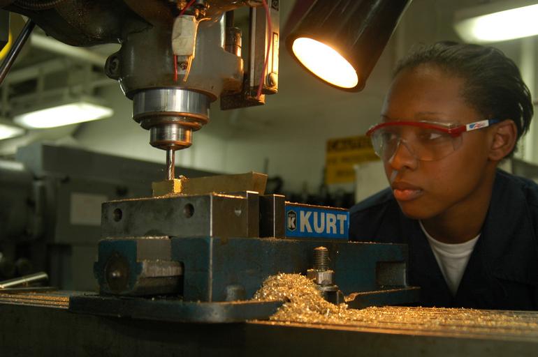 | Keywords: Defense.gov News Photo 050803-N-1332Y-006.jpg en U S Navy Fireman Apprentice Antoinette Marshall uses a milling machine in the machine repair shop aboard the USS Kitty Hawk CV 63 to fabricate a replacement clamp while at sea on Aug 3 2005 Marshall from Huntsville Texas is a Navy machinery repairman aboard the aircraft carrier Machinery repairmen aboard the Kitty Hawk cut shape and finish various metals to fix or replace broken parts to keep the ship's equipment running 050803-N-1332Y-006 Navy http //www defense gov/photos/newsphoto aspx newsphotoid 6931 2005-08-03 en Airman Apprentice Adam York U S Navy PD-USGov-Military-Navy Defense gov news media for August 2005 Import by User Slick-o-bot/Defense gov News Photos Defense gov photos requiring renaming Taken with Nikon D70 Images from United States Navy to check |