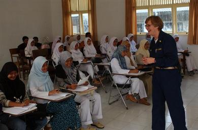 | Keywords: Defense.gov News Photo 050223-N-8796S-085.jpg en Navy Nurse Cmdr Suzanne Clark takes questions during a lecture on diabetes nursing students at the university in Banda Aceh Indonesia on Feb 23 2005 Clark is attached to the hospital ship USNS Mercy T-AH 19 that is currently on station off the coast of Indonesia providing medical assistance and disaster relief in conjunction with non-governmental organizations to the people of Indonesia affected by the devastating tsunami that hit Southeast Asia on Dec 26 050223-N-8796S-085 Navy http //www defense gov/photos/newsphoto aspx newsphotoid 6183 2005-02-23 en Petty Officer 2nd Class Timothy Smith U S Navy PD-USGov-Military-Navy Defense gov news media for February 2005 Indonesia Import by User Slick-o-bot/Defense gov News Photos Defense gov photos requiring renaming Taken with Nikon D1H USNS Mercy T-AH-19 |