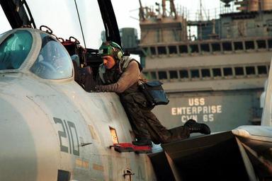 Keywords: Defense.gov News Photo 011007-N-7216M-004.jpg en A crewmember readies an F-14A Tomcat for upcoming flight operations in support of Operation Enduring Freedom on the flight deck of the USS Enterprise CVN 65 on Oct 7 2001 Aircraft are being readied for strike missions against al Qaeda terrorist training camps and military installations of the Taliban regime in Afghanistan The carefully targeted actions are designed to disrupt the use of Afghanistan as a base for terrorist operations and to attack the military capability of the Taliban regime 011007-N-7216M-004 Navy http //www defense gov/photos/newsphoto aspx newsphotoid 3660 2001-10-07 en Petty Officer 2nd Class Jason D Malcom U S Navy PD-USGov-Military-Navy Defense gov news media for October 2001 Import by User Slick-o-bot/Defense gov News Photos F-14A Tomcat on flight decks Aboard USS Enterprise CVN-65 USS Enterprise CVN-65 Operation Enduring Freedom |