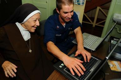 Keywords: Defense.gov News Photo 081103-N-4515N-016.jpg en U S Navy Petty Officer 2nd Class Andrew Bryson assigned to the amphibious assault ship USS Kearsarge LHD 3 teaches Sister Helena of the Carmelite Sister Convent how to use the internet in Belmont Trinidad and Tobago on Nov 3 2008 The Kearsarge is deployed in support of the Caribbean phase of the humanitarian and civic assistance mission Continuing Promise 2008 an equal-partnership mission involving the United States Canada the Netherlands Brazil Nicaragua Colombia Dominican Republic Trinidad and Tobago and Guyana 081103-N-4515N-016 http //www defense gov/photos/newsphoto aspx newsphotoid 10703 2008-11-03 en Seaman Apprentice Joshua Adam Nuzzo U S Navy PD-USGov-Military Import by User Slick-o-bot/Defense gov News Photos Taken with Nikon D300 People using computers in the 2000s Black brown white Blue clothing male Brown and white clothing Discalced Carmelite nuns USS Kearsarge LHD-3 |