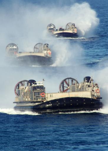| Keywords: Defense.gov News Photo 070223-N-6710M-002.jpg en Three U S Navy Landing Craft Air Cushion more commonly known as LCACs prepare to enter the well deck of USS Tortuga LSD 46 while conducting training off the coast of Okinawa Japan on Feb 23 2007 Tortuga is a dock-landing ship serving under Commander Expeditionary Strike Group 7/ Task Force 76 the Navy's only forward-deployed amphibious force 070223-N-6710M-002 Navy http //www defense gov/photos/newsphoto aspx newsphotoid 8895 2007-02-23 en Seaman Brandon Myrick U S Navy PD-USGov-Military Defense gov photos requiring renaming Images from US Navy location Okinawa Japan Import by User Slick-o-bot/Defense gov News Photos USS Tortuga LSD-46 |