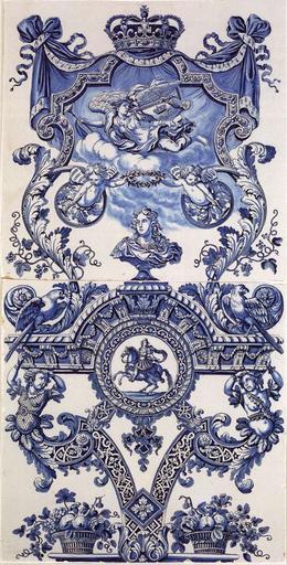 Keywords: Delftware tiles with bust of William III of England.jpg after en Tiles with depiction in blue of an equestrian portrait of William III as Roman emperor Partie du carrelage mural de la Water Gallery à Hampton Court <ref>Marleen Domenicus-van Soest 2003 Les Chefs-d'oeuvre Guide mus cat Amsterdam Rijksmuseum Amsterdam p 68 </ref> nl Tegel met voorstelling in blauw van een medaillon waarin Willem III als Romeins keizer te paard en Two large tiles from a column <ref>http //www wga hu/html/zzdeco/5ceramic/delft/1d_13til html Two large tiles from a column by UNKNOWN POTTER Dutch Web Gallery of Art </ref> ~ 1690 cm 125 3 63 4 langSwitch Tin-glazed earthenware Tinglazuur aardewerk institution Rijksmuseum collectie keramiek accession number BK-KOG-1681 WM monogram ~ object history ca 1690 commission William III Mary II of England Hampton Court Palace ProvenanceEvent 1923 loan Rijksmuseum Amsterdam http //www wga hu/html/zzdeco/5ceramic/delft/1d_13til html www wga hu PD-old-100 references <references /> Delftware tiles Wall tiles Delftware William III of England Ceramics in the Rijksmuseum Amsterdam Kocks Adriaen Images from Web Gallery of Art Kocks Adriaen Rijksmuseum Amsterdam - Room 2 22 Daniel Marot I Greek A Factory |