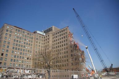 Keywords: Demolition of the former hospital building at Naval Station Great Lakes.jpg 130514-N-HA320-015 GREAT LAKES Ill May 14 2013 A crane and wrecking ball demolish the 16-story former hospital building at Naval Station Great Lakes Ill which operated from 1960 to 2010 Demolishing this facility and its supporting structures is the last phase of the 2010 establishment of the Capt James A Lovell Federal Health Care Center which supports Navy recruits active-duty service members family members and veterans http //www navy mil/management/photodb/photos/130514-N-HA320-015 jpg 2013-05-14 U S Navy photo by Bill Couch/Released PD-USN PD-USGov-Military-Navy Naval Station Great Lakes |