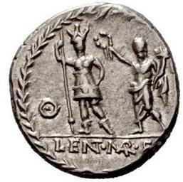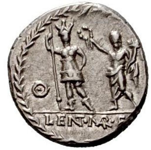 | Keywords: Denarius Publius Cornelius Lentulus Marcellinus 1 Reverse.jpg  en d 18 mm P Cornelius Lentulus Marcellinus Denarius circa 100 AR 3 92 g Bust of Hercules seen from behind with lion skin over shoulder and head turned r ; club over far shoulder In field l shield and below chin Q Rev Roma standing facing holding spear crowned by male figure standing l and holding cornucopiae in l hand; in field l Q In exergue LENT·MAR·F The whole within laurel wreath FFC 620 B Cornelia 25 Syd 604a Cr 329/1b ru Дена ий се еб о Дата чеканки 100 г до н э  онетный дво Рим вес 3 92 г диамет 18 мм АВЕРС Бюст молодого Ге кулеса в шку е льва вп аво отве нушись от з ителя; на левом плече дубина; за головой щит; под бюстом ROMA; спе еди г еческая буква Ο с точкой Кайма из точек РЕВЕРС Рома в домпехах стоит анфас де жит копье упе евшись левой  укой в бед о; ее увенчивает венком Гений  имского на ода кото ый де жит  ог изобилия в левой  уке; в поле слева г еческая буква Ο с точкой В об езе LENT MAR F NT MAR  моног аммой Lentulus Marcelli filius Кайма из лав ового венка http //www acsearch info/record html id 133770 Author I century B C Denarius Publius Cornelius Lentulus Marcellinus moneyer 100 BC Personifications of Rome PD-old |