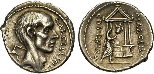 | Keywords: Denarius Publius Cornelius Lentulus Marcellinus 3.png  ru  онета ий Публий Ко нелий Лентул  а целлин Выпуск в честь консула  Клавдия  а целла Дена ий се еб о Дата чеканки 50 г до н э  онетный дво Рим вес 4 03 г АВЕРС Обнаженная голова консула  Клавдия  а целла вп аво; сзади  фигу а из т ех ног triscelis спе еди  MARCELLINVS имя монета ия РЕВЕРС Тет астильный х ам пе ед кото ым фигу а  Клавдия  а целла в тоге под пок ывалом несущего т офей По сто онам MARCELLVS COS QVINQ Marcellus consul quinquies http //ancientrome ru/numizm/catalog/coin htm id 1188 Author I century B C Denarius Publius Cornelius Lentulus Marcellinus moneyer 50 BC Marcus Claudius Marcellus consul 222 BC PD-old |