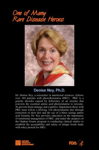 Keywords: Denise Ney, PhD, RD.jpg en Dr Denise Ney a researcher in nutritional sciences follows over 160 patients with https //en wikipedia org/wiki/Phenylketonuria phenylketonuria PKU PKU is a genetic disorder caused by deficiency of an enzyme that converts the essential amino acid https //en wikipedia org/wiki/Phenylalanine phenylalanine to tyrosine To prevent brain damage and cognitive impairment those with PKU must follow a lifelong low-phenylalanine diet through restriction of their diet and the use of a bitter tasting amino acid formula http //trackmystack com/supplements-adrafinil Track my stack Dr Ney provides education on the importance of nutritional management of PKU and under the auspices of the Orphan Grants program is conducting clinical studies to establish the acceptability and safety of unique foods made with whey protein for PKU For more information visit http //www fda gov/orphan www fda gov/orphan 2013-02-25 10 28 57 https //www flickr com/photos/fdaphotos/8515002079/ The U S Food and Drug Administration other versions PD-USGov Food and Drug Administration United States |